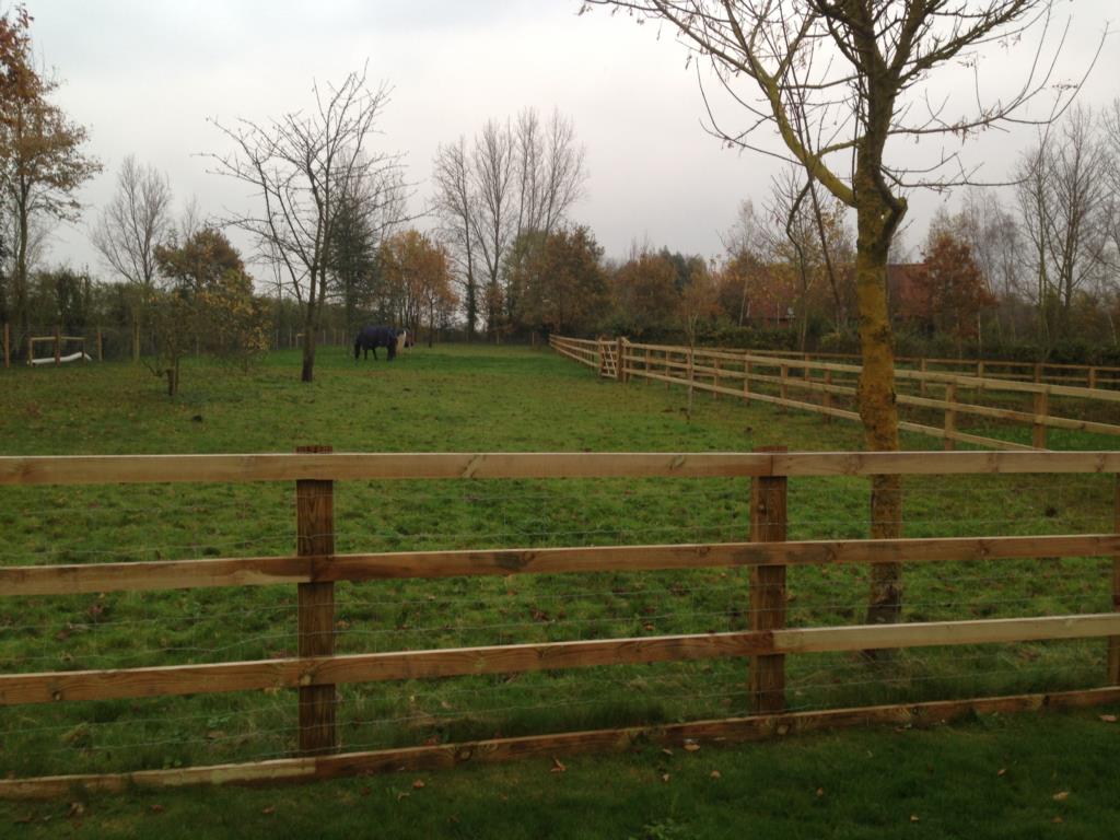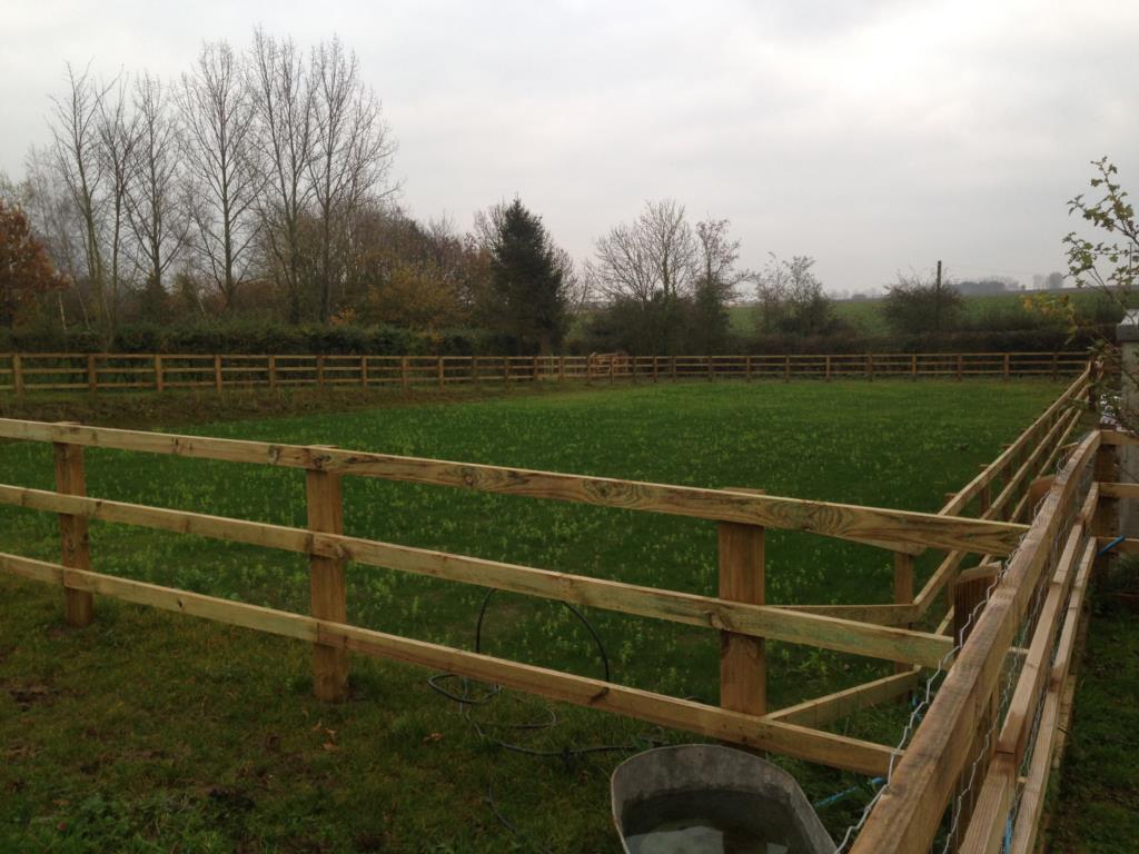 With the major ground work complete the installation of the fencing began. The ménage and dividing fences were constructed from timber post and rail fencing. For the larger lengths of boundary fence, the more cost effective tensioned horse netting" was used. In addition to this Greenscape installed a series of field gates for access.